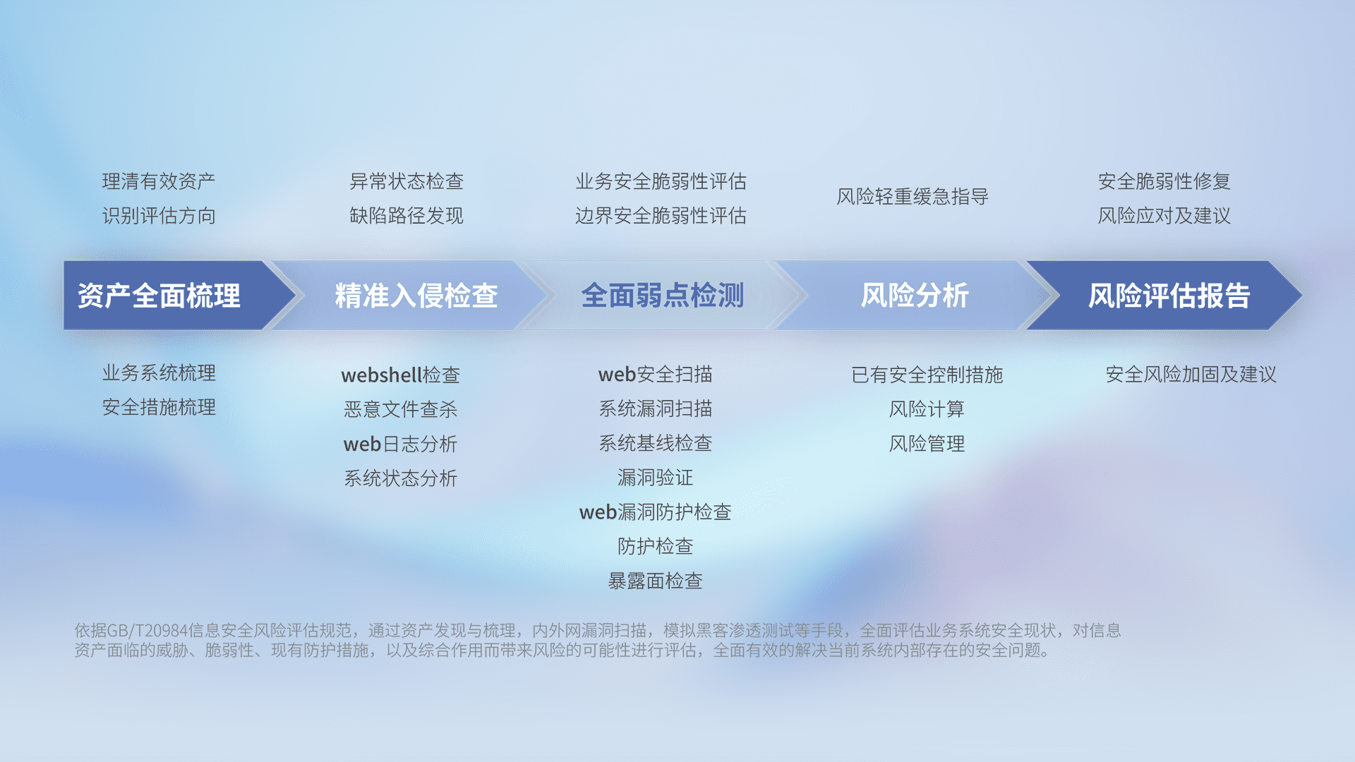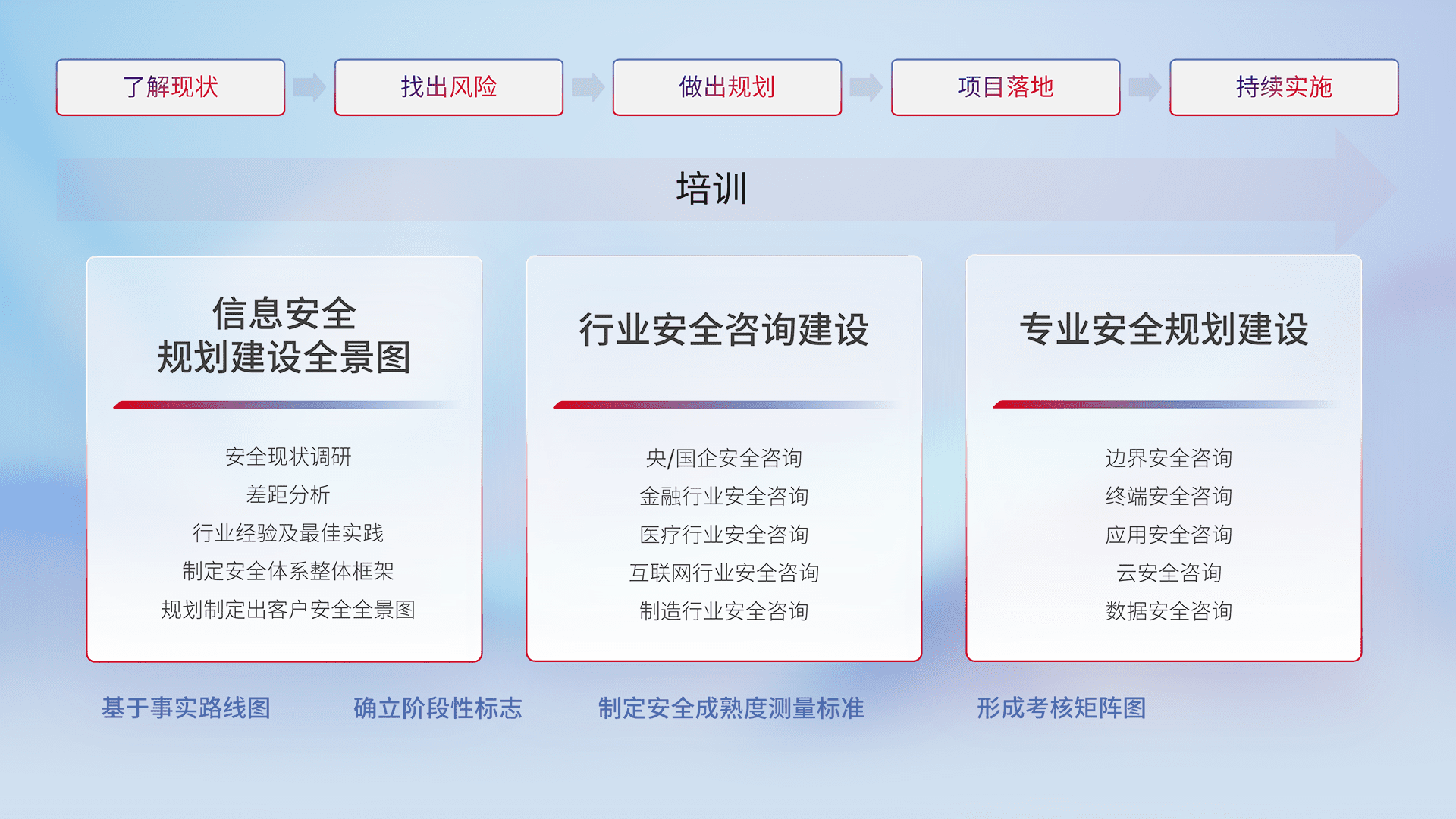 针对客户行业特性,,以专业的安全服务+多厂商联合解决方案提供专属的一站式安全管理服务,,帮助客户全面感知网络空间威胁,,基于识别、、、检测、、、、分析、、、、防护、、监测、、、响应的服务理论模型,,,从方案咨询、、、集成交付、、、、评估验证、、、优化加固、、、、运维运营,,,,致力于为客户提供完整的闭环管理式安全服务。。以实战经验为客户打造高抵御风险的安全体系,,帮助客户发现威胁、、、对抗威胁、、、、处置威胁,,不断积累安全对抗能力,,,,持续保障数字化安全。。